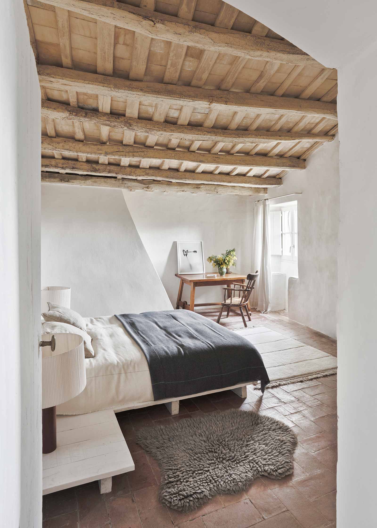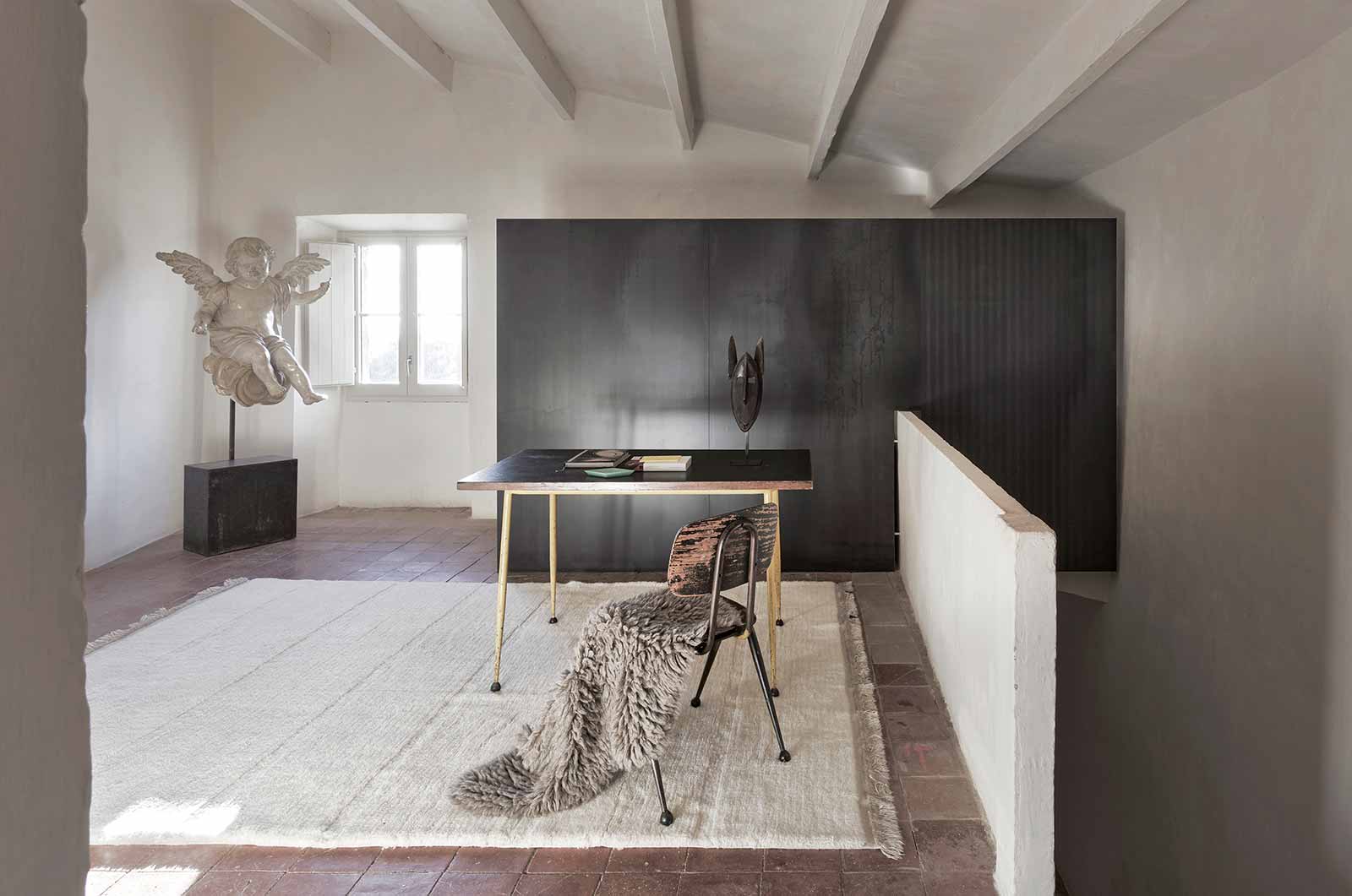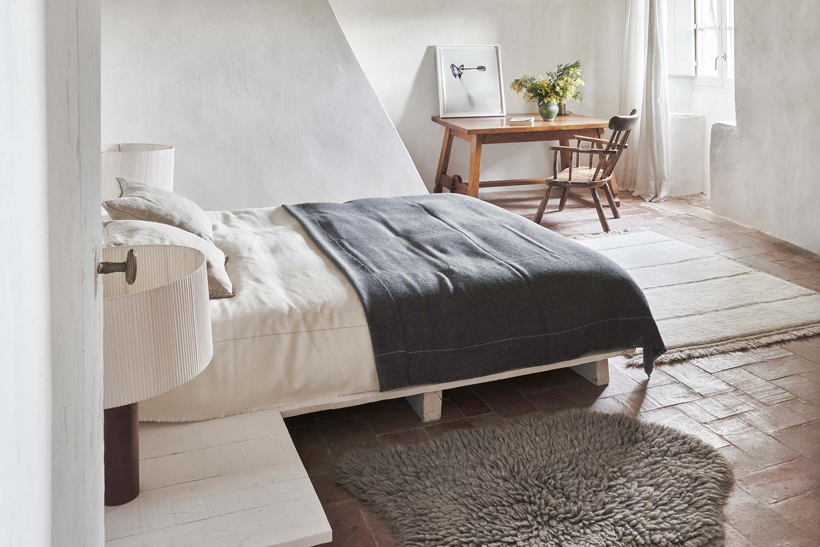 La alfombra Woolly de Lorena Canals tiene forma redondeada, imitando la silueta de una piel de oveja, y está hecha de un mullido pelo de lana sobre una base de algodón.